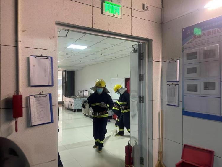 此次演习共有101人参加,模拟起火场景地点分别为政务中心项目部B2中水机房及劳动大厦项目部东楼B1空调机房。工程部及设备设施维保人员在巡视机房时发现起火并迅速拨打消防电话通知中控室,中控室接到通知后紧急通知微站,同时果断启动应急预案;微站队员用时1分53秒迅速到达现场进行火灾扑救,疏散组及时疏散附近人员,物资抢运组及时查看并转移附近重要物资,整个演习用时12分钟结束。